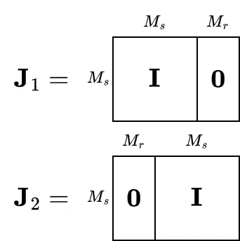 ここで、\({\mathbf J}_{1}\)、\({\mathbf J}_{2}\)はサブアレイ選択行列で以下のように表されます。\( {\mathbf I}\ \)は単位行列です。